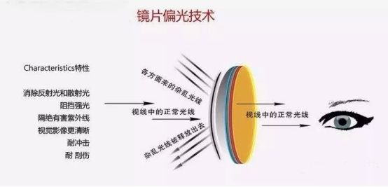 偏光太阳镜可将自然光中的乱反射光、强光束中的散射光线、眩光、以及物体表面不规则的反射光,进行有效地滤除与整合,使杂乱的光线能归于同一轨道,这个轨道如果与眼睛的透光轴平行,那么投入眼睛的光线将非常柔和,使视野中的视觉影像清晰自然。