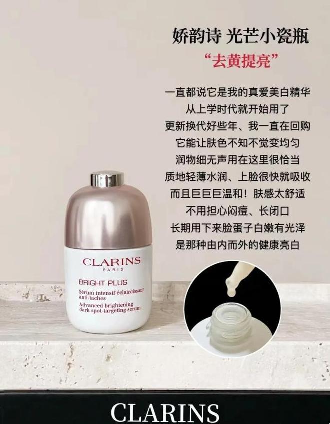 里面添加了传明酸+烟酰胺+色淡林,来源头掐灭黑色素冒头,淡化斑点色沉,外加稳定VC来抗氧提亮,对熬夜暗沉黄气拳打脚踢,最后AB5D四重舒缓体系还给敏皮保驾护航。