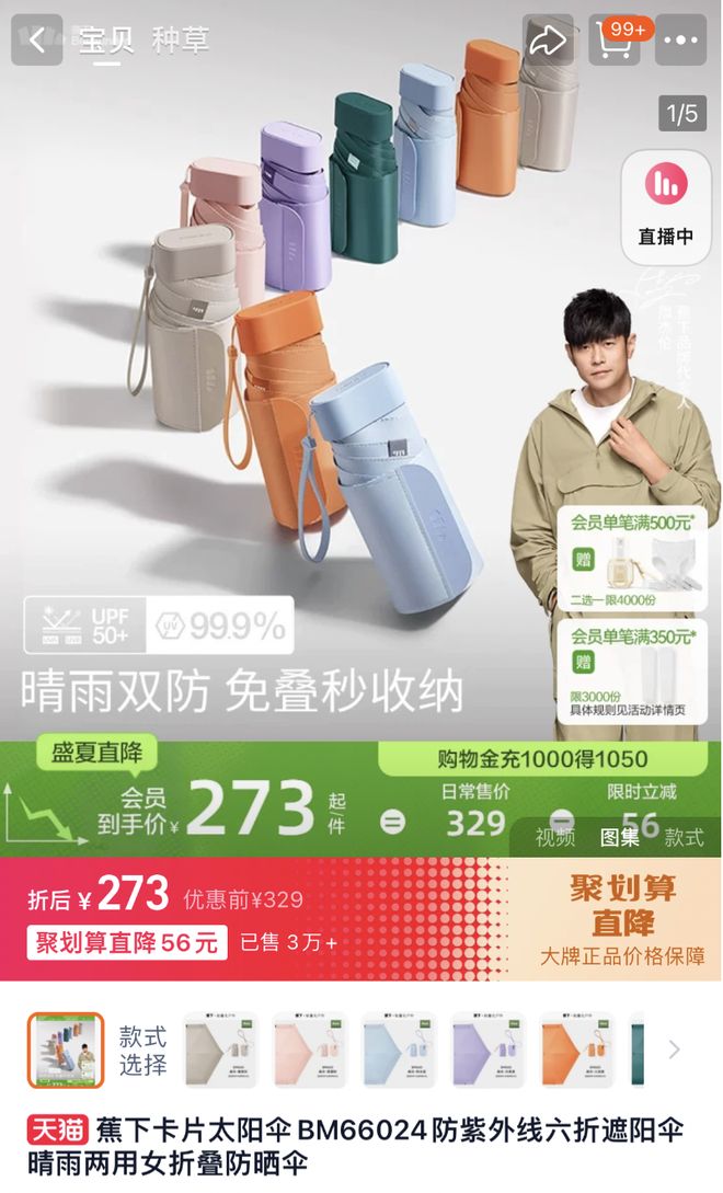 高营收与高定价不无关系。在蕉下的店铺中,遮阳伞的售价在179元至369元之间,而天堂牌遮阳伞的定价在30元至50元左右。整整高出后者6到10倍。