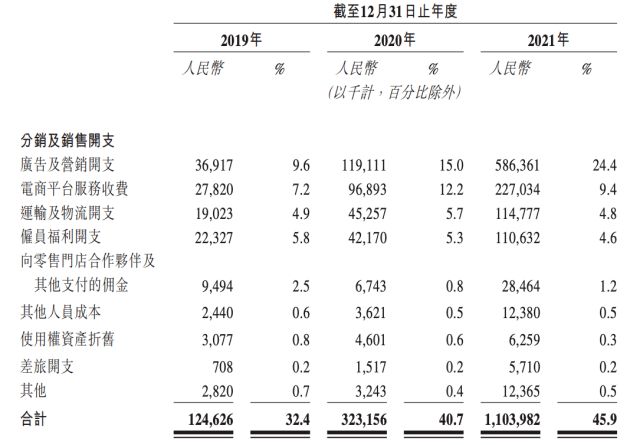 招股书显示,2019年到2021年,蕉下分别实现营业收入3.85亿元、7.94亿元、24.07亿元。毛利分别为1.92亿元、4.56亿元及14.22亿元,同期的总毛利率分别为50.0%、57.4%及59.1%,2021年的毛利率直逼六成。以2021年为例,蕉下的净利润率不足6%,毛利率却高近60%,相差约10倍。计算净利时刨除的各项成本支出,在哪些地方花去了大价钱?