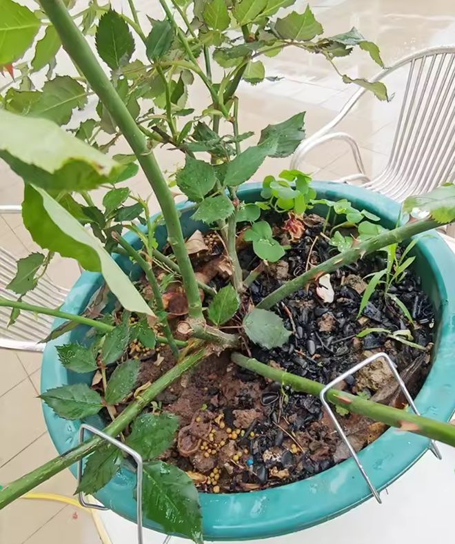 添加新土,不要压太实,原土面和新添加的土要齐平,不要把月季的主干埋土里。