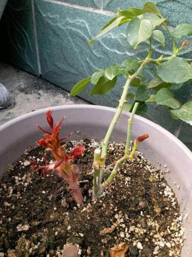 等这些笋枝长得比较粗壮,开始萌发新的花苞,就可以把这些压平的老枝剪断。这样你就可以得到冠幅更大,开花枝更多的盆栽月季了。