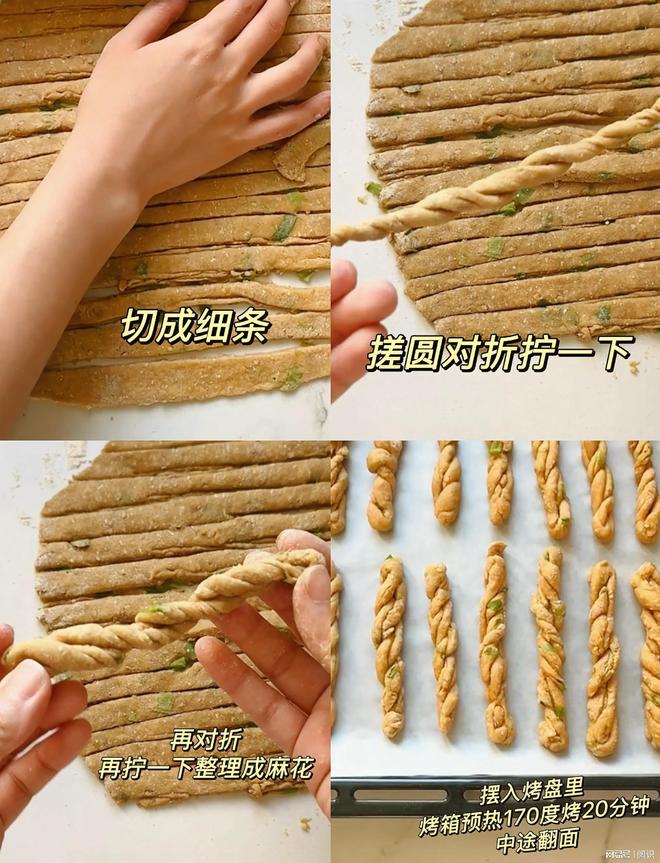 3️⃣:擀好再用刀切成细条,再把切好的细条搓圆条,对折拧几圈,再对折,再次拧几圈,整理成麻花形状;