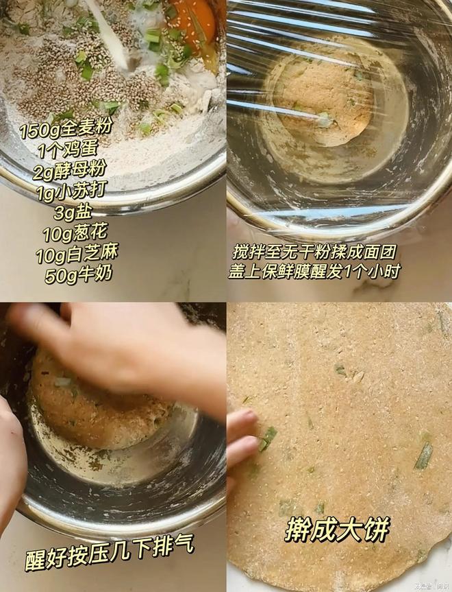 1️⃣:大碗里加入150g全麦粉➕1个鸡蛋➕2g酵母粉➕1g小苏打➕3g食用盐➕10g小葱花➕10g白芝麻➕50g纯牛奶,先用筷子搅拌成无干粉,再下手揉成面团;